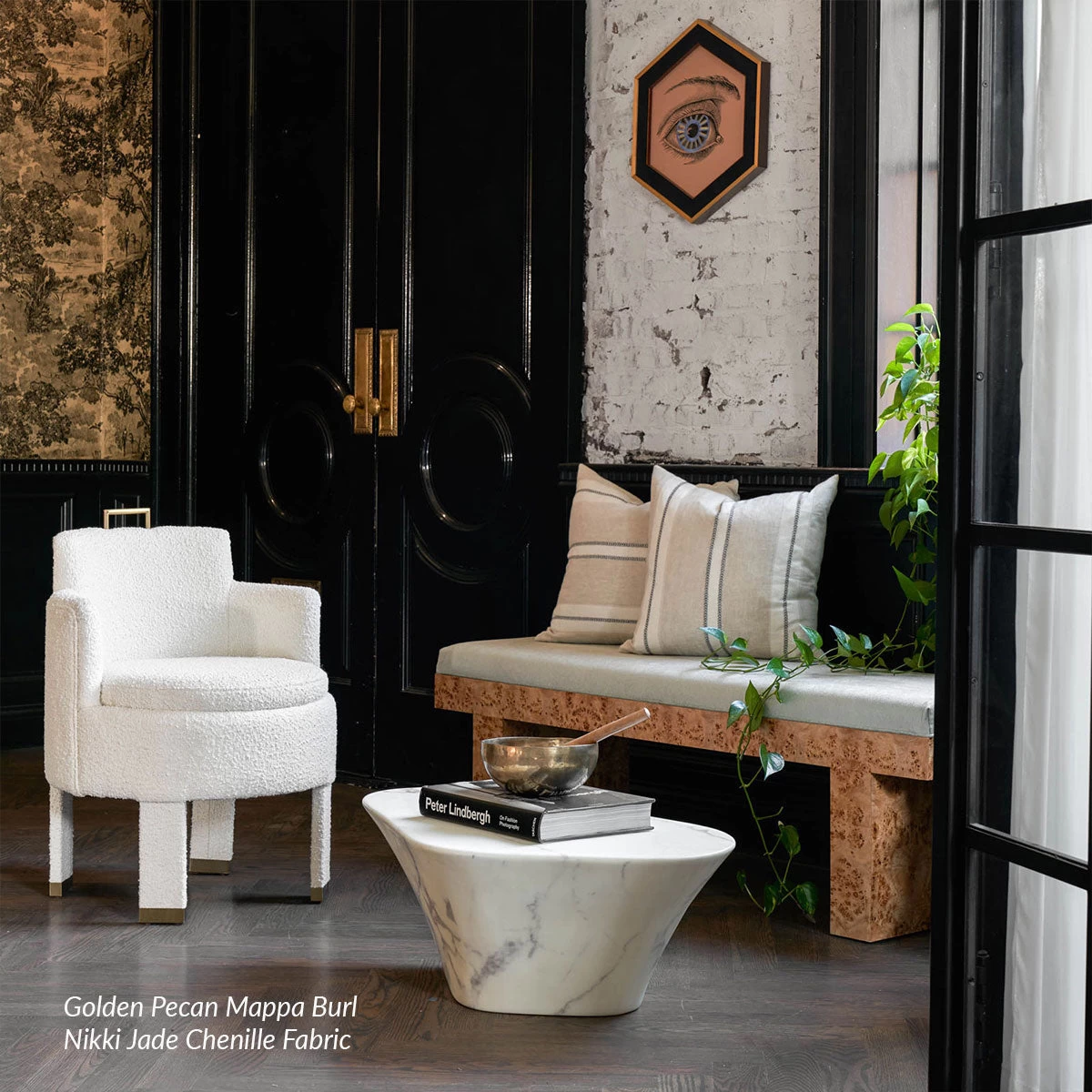 Select from lacquer and wood finish options to create the base of your bench. Take the customization even further by choosing from our select fabrics to upholster the cushion.