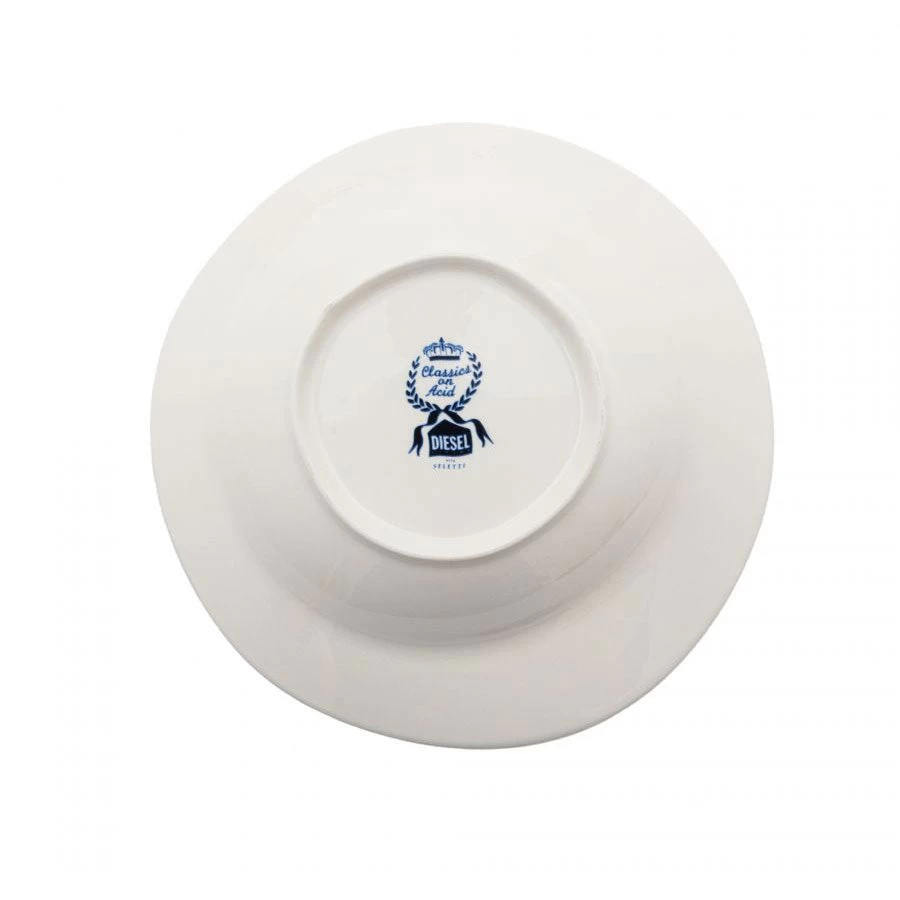 A traditional ceramic with a twist – call it classics on acid. Soup plate by Seletti featuring a warped bird & flower motif in blue.