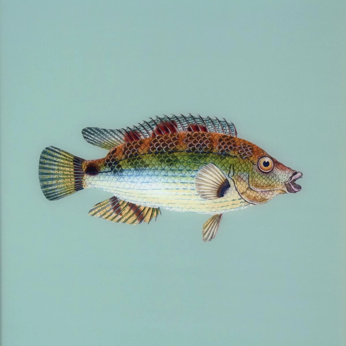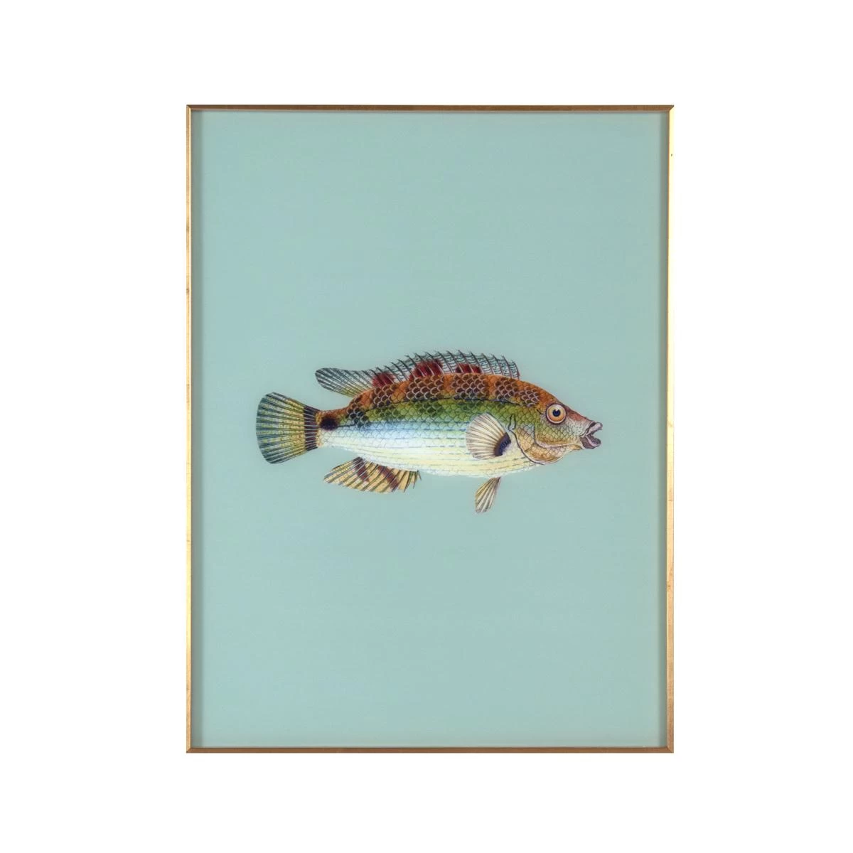 Scout exclusive pastel fish artwork. UV printed on acrylic film with a black and gold frame.