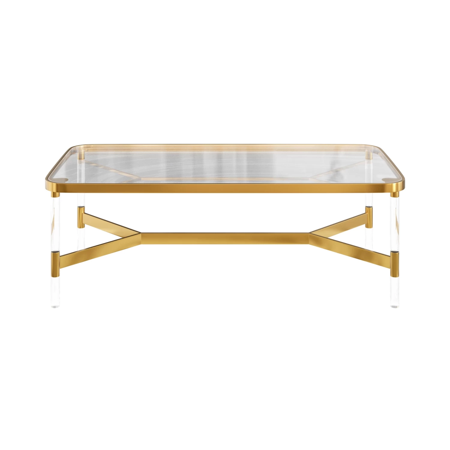 Topped with clear glass, this barely-there beauty has an acrylic & brass base for a touch of glam.