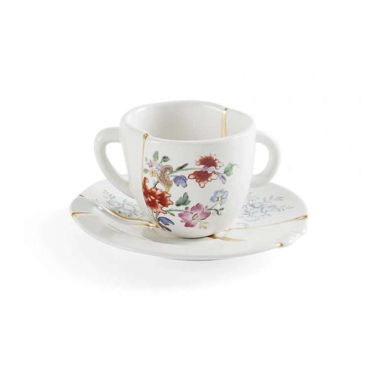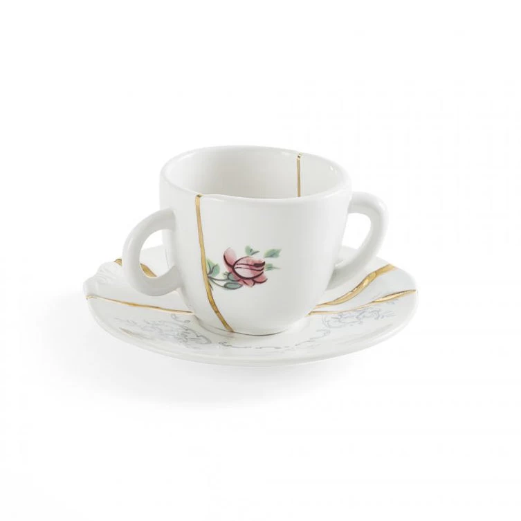 Kintsugi Japanese art assumes contemporary shapes. The delicate porcelain is glorified and enriched with gold fragments for a tableware collection made of charming and unexpected compositions.