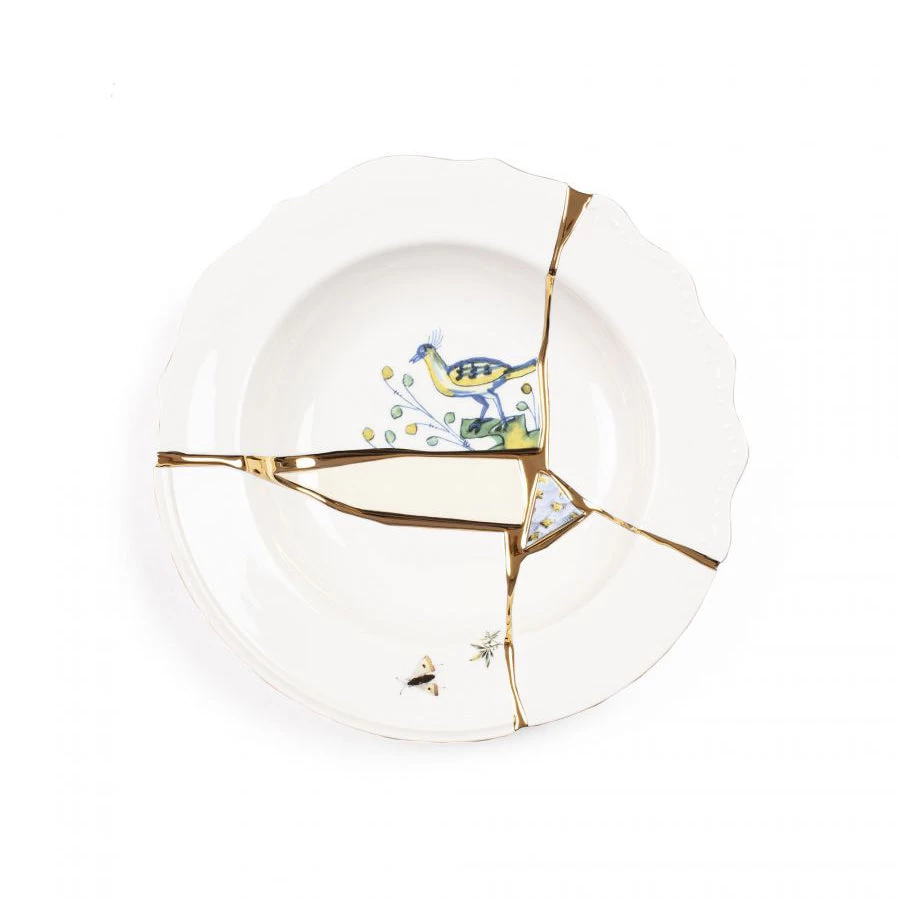 Kintsugi Japanese art assumes contemporary shapes. The delicate porcelain is glorified and enriched with gold fragments for a tableware collection made of charming and unexpected compositions.