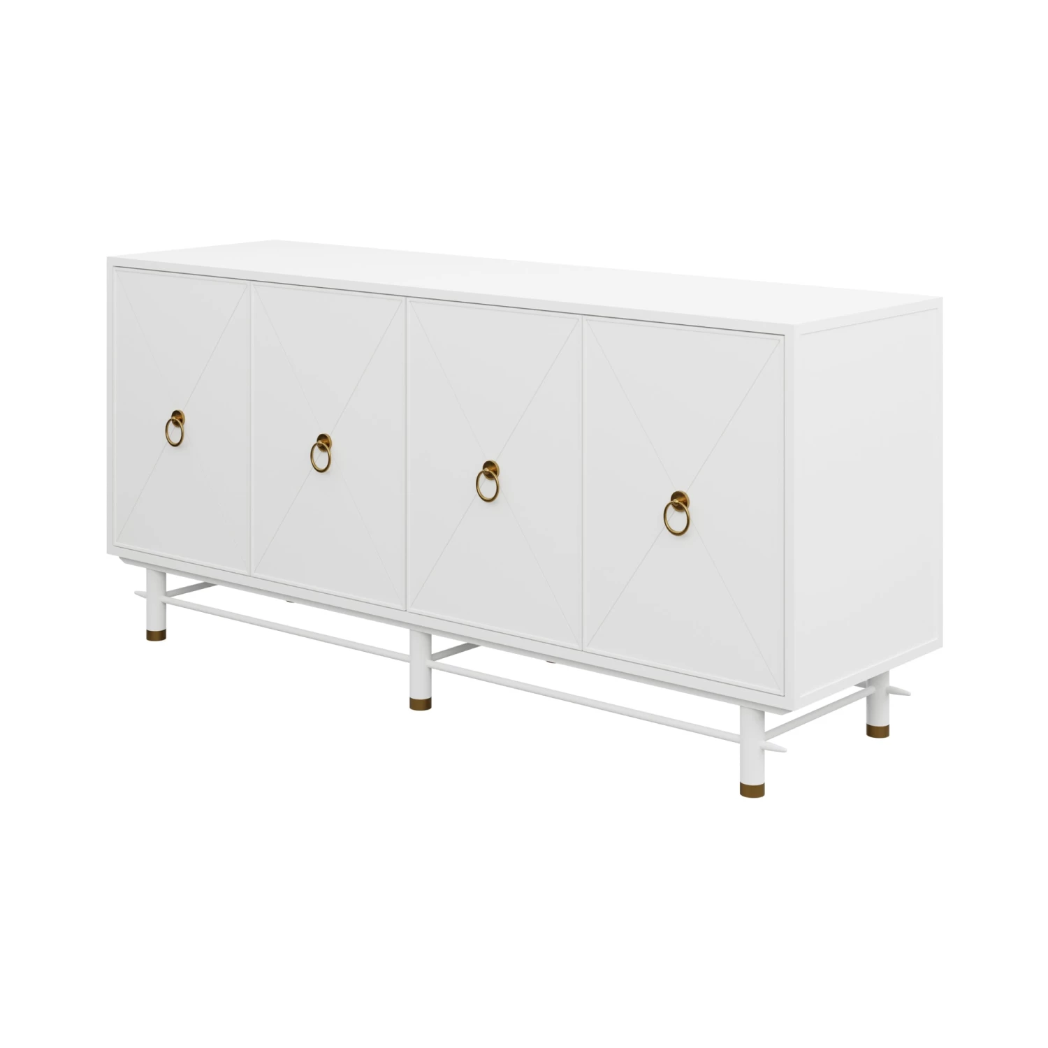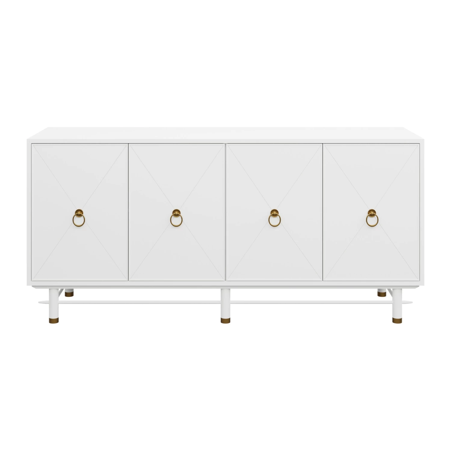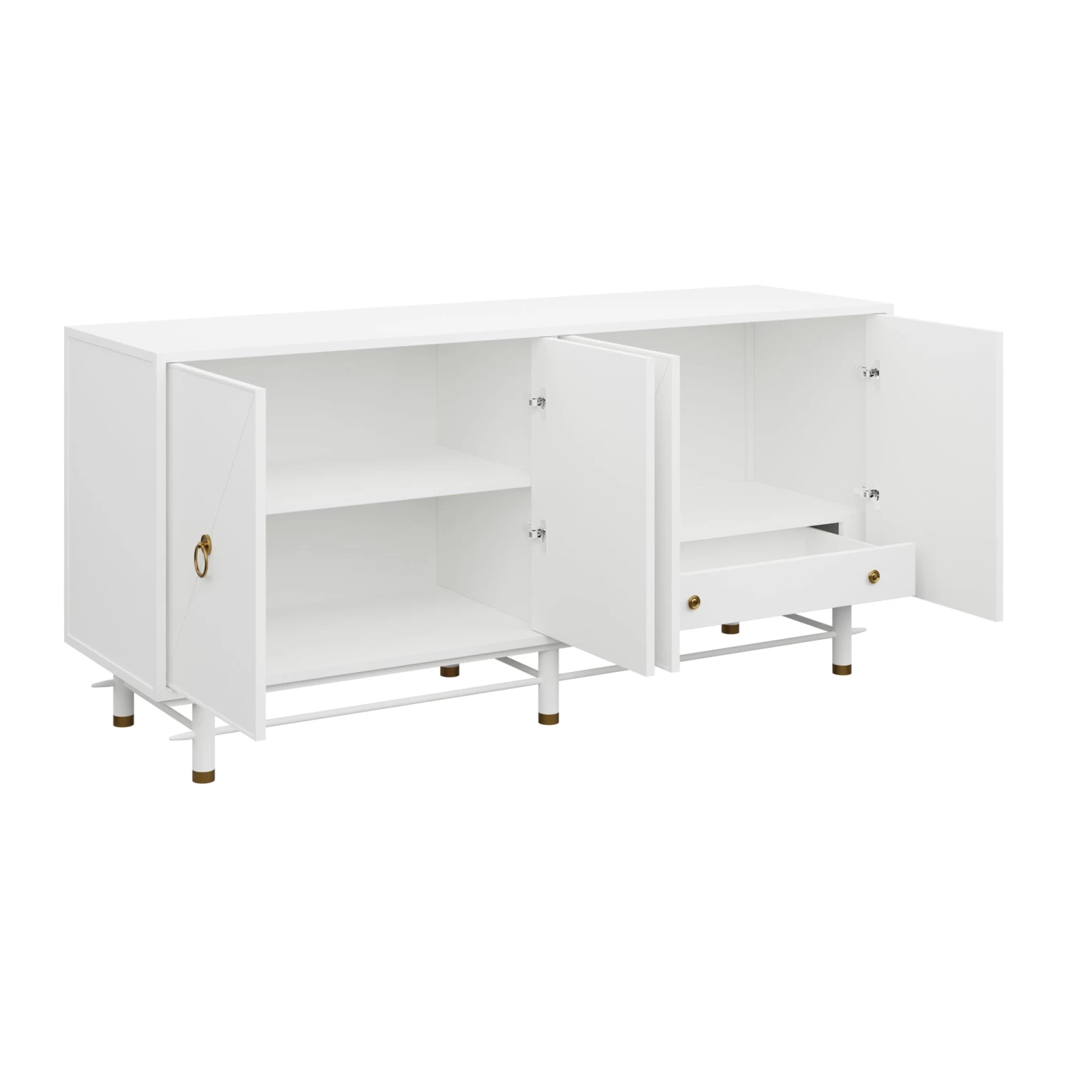 Now available as a credenza, Laird keeps it unique with a cross bar base and diamond cutouts. Matte white lacquer frames 4 doors that open to reveal 2 roomy cabinet interiors with a soft close drawer on the right side and an adjustable shelf on the left.