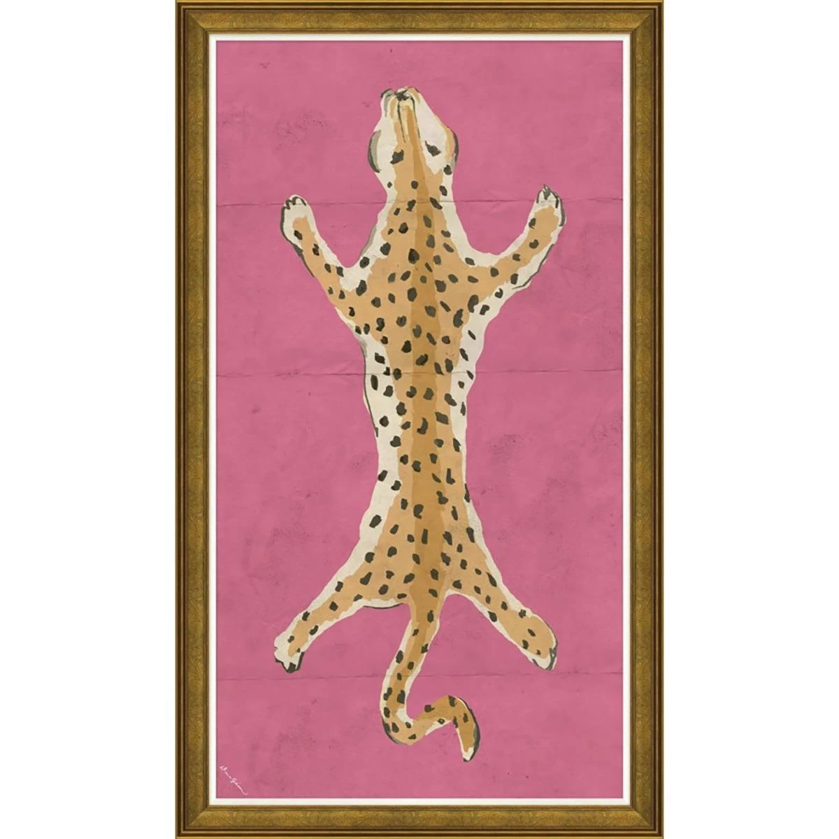 This archival giclée leopard print comes fully framed in wood with a brass finish and plexiglass panel.