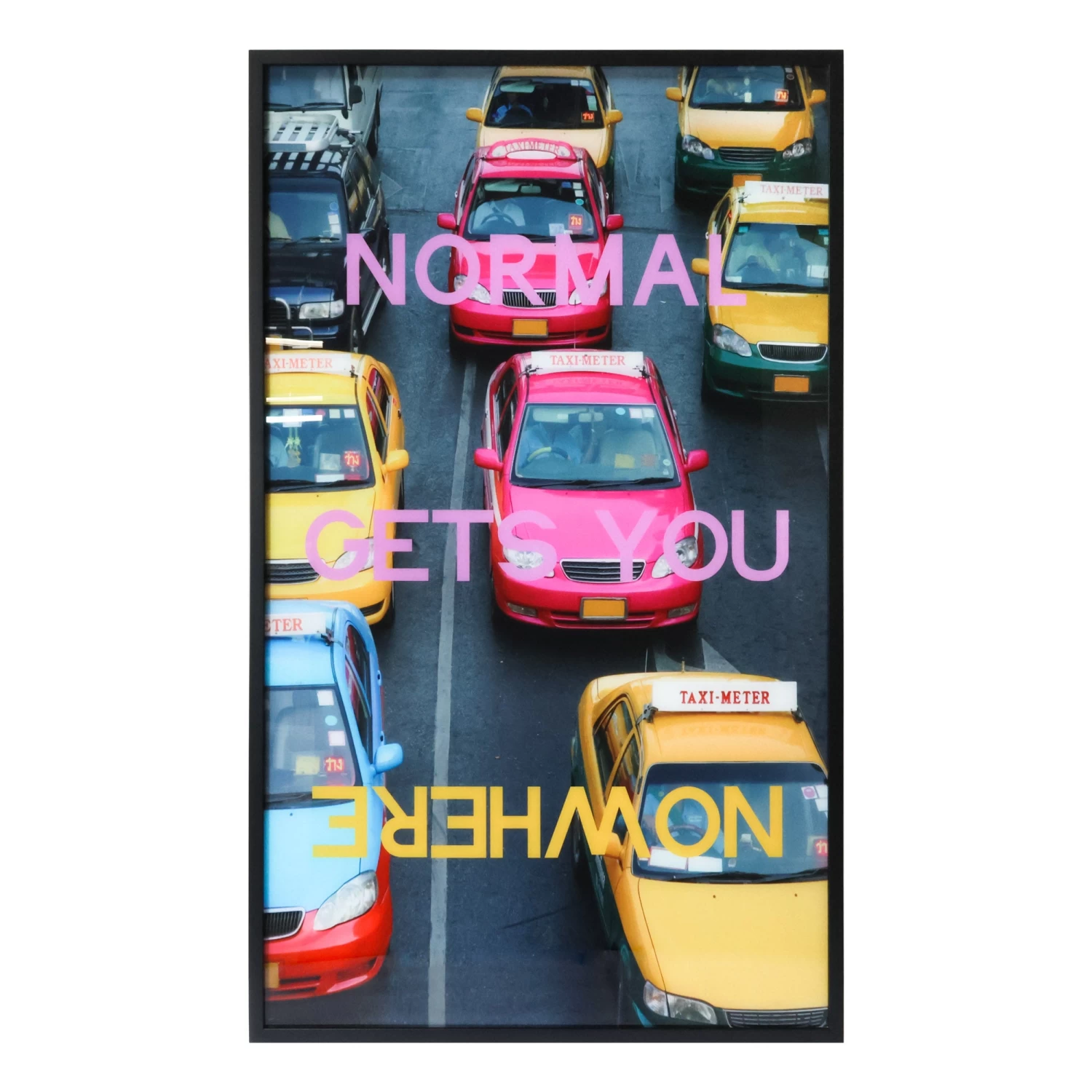 Pink & yellow taxi photography print featuring the phrase ‘Normal Gets You Nowhere’ that lights up when plugged in. Framed in black.