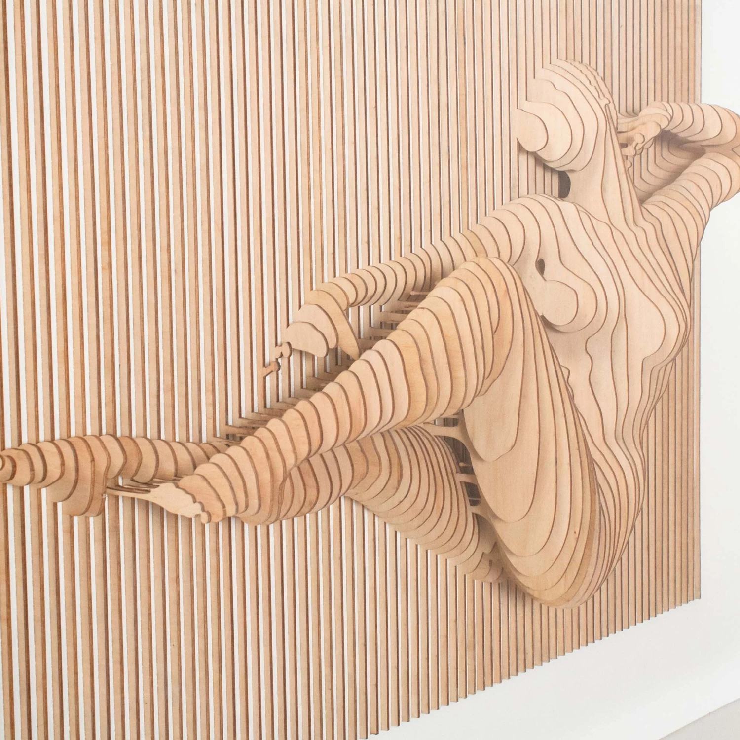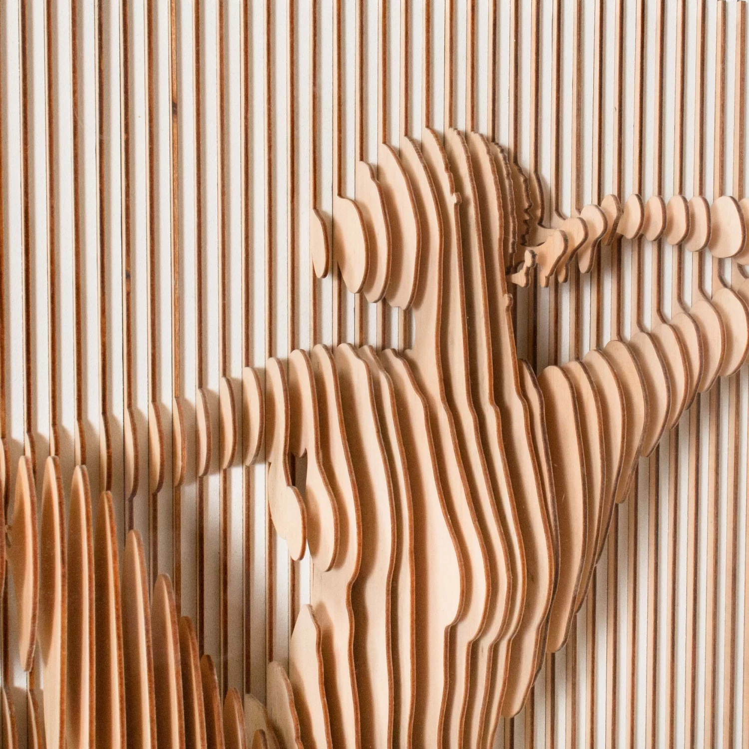 Mixed media artwork by Tat Frederick. Laser cut wood forms the body of a female with a stunning 3D effect. Mounted on white sandstone.