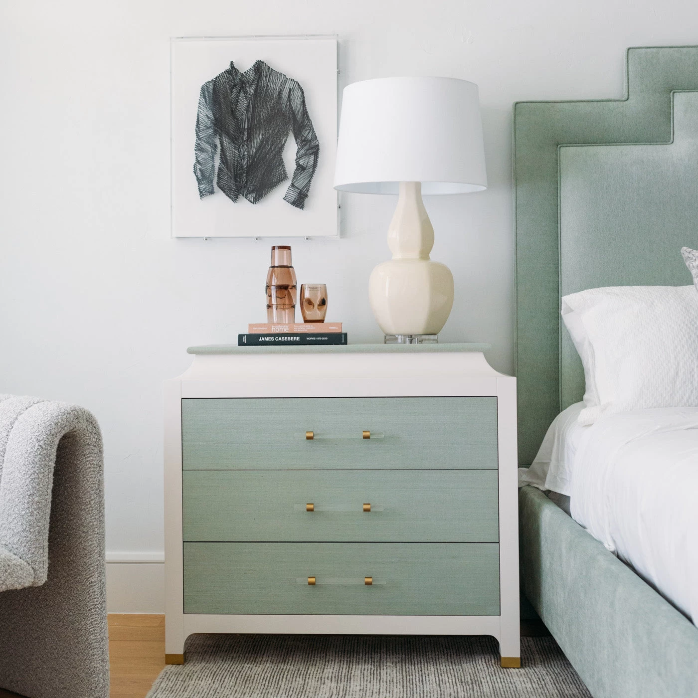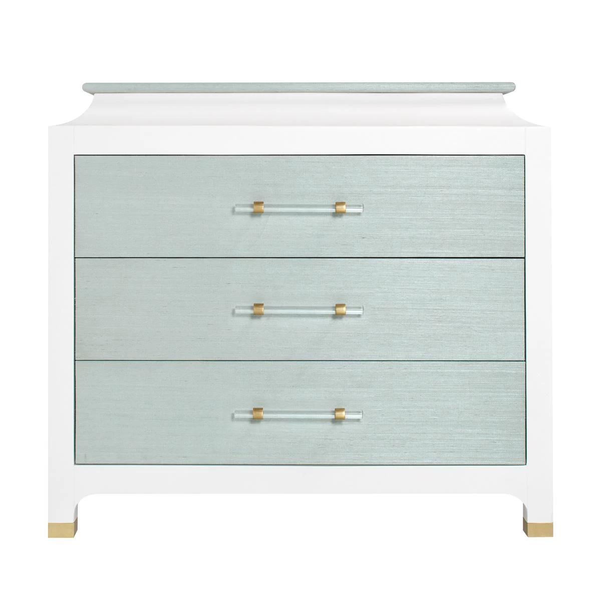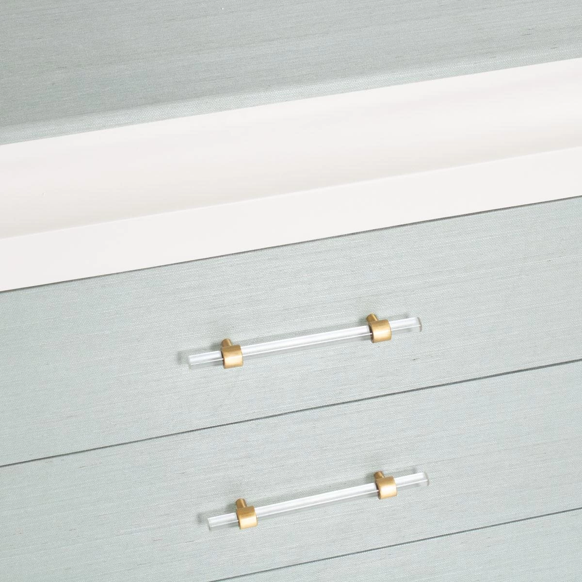 The Recon features a white lacquer finish with the drawers and top in our Caroline Grasscloth. Finished with acrylic and brushed brass handles with brass sabots for a glamorous look.