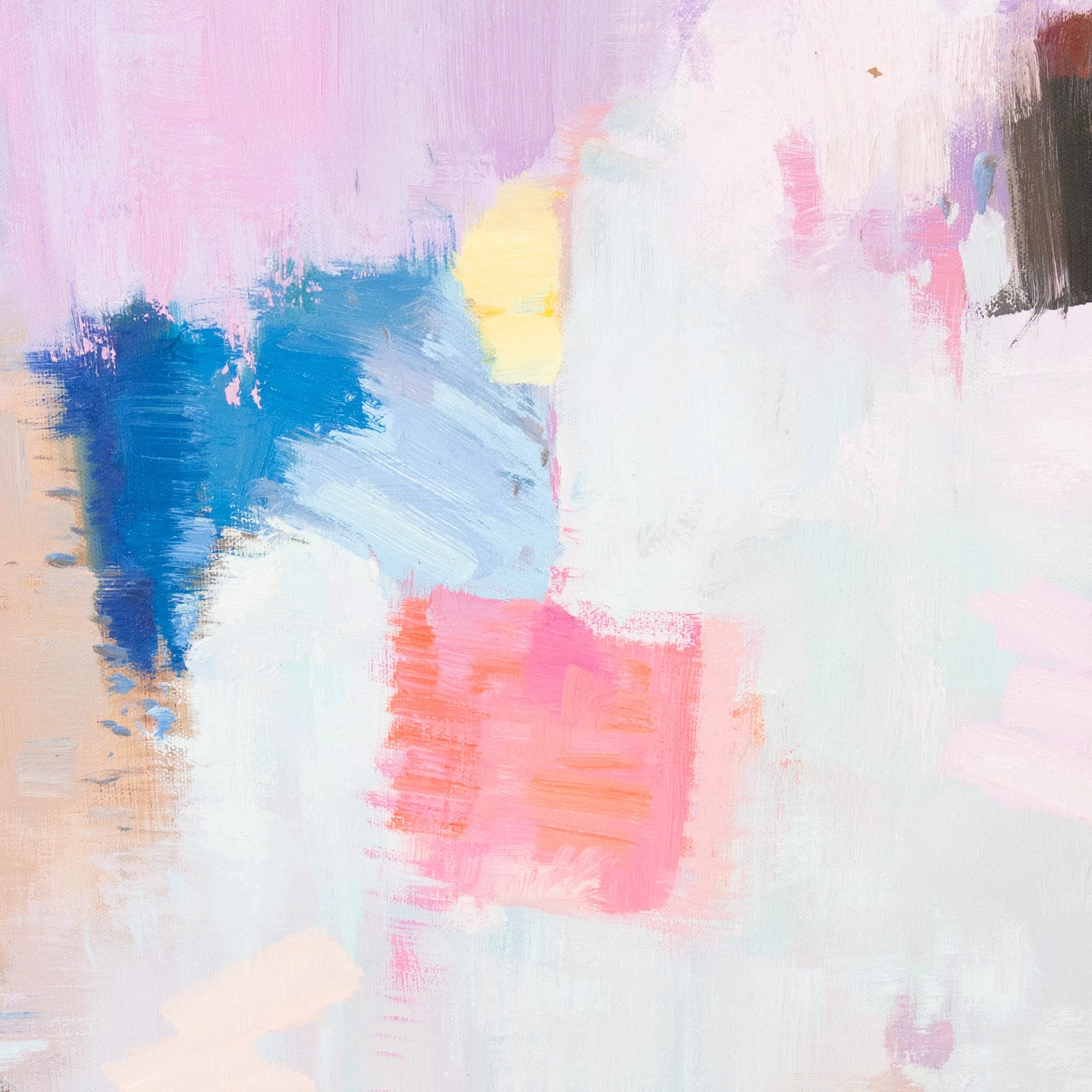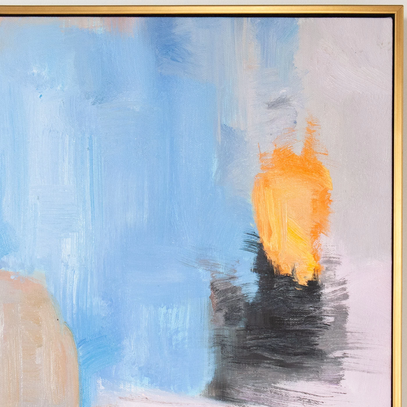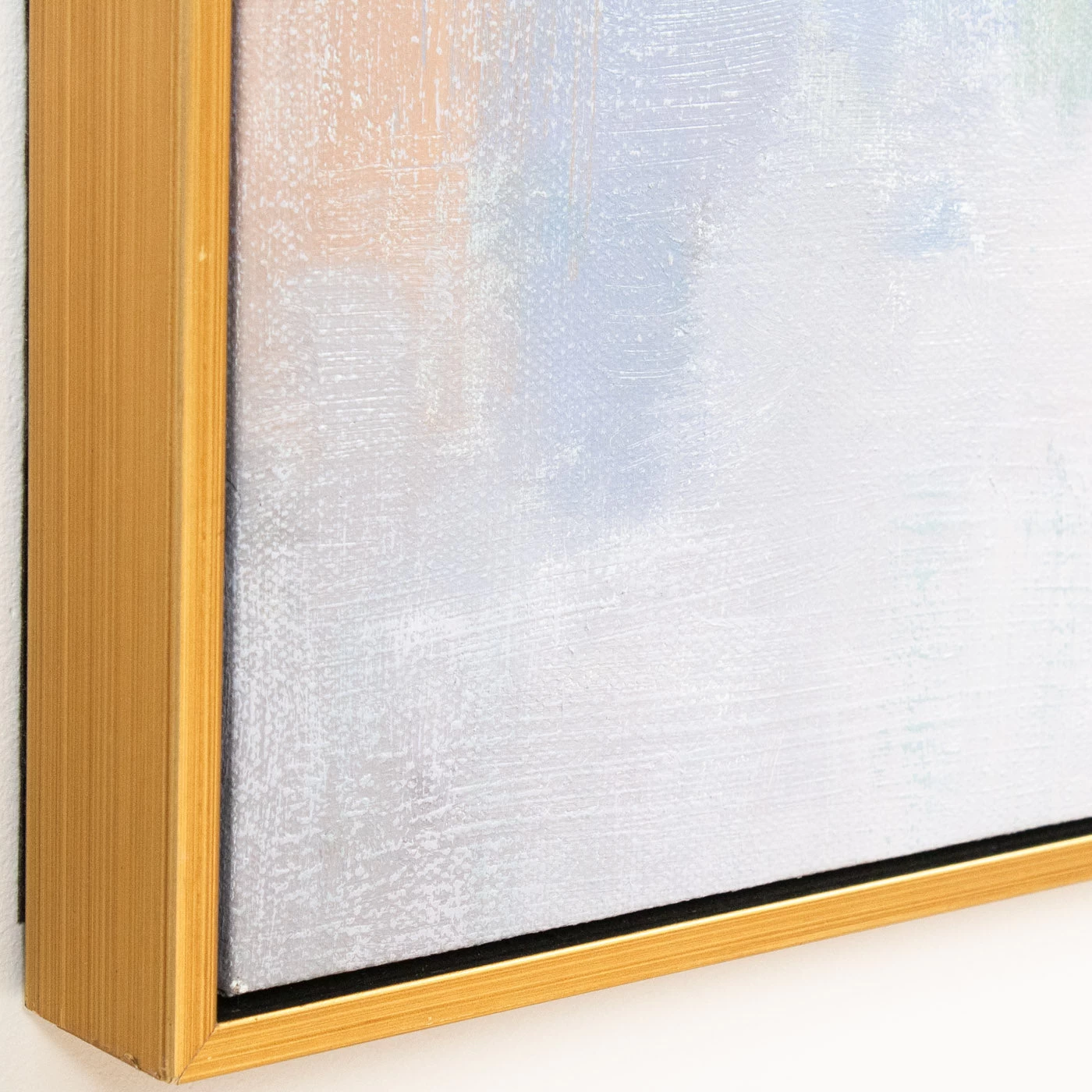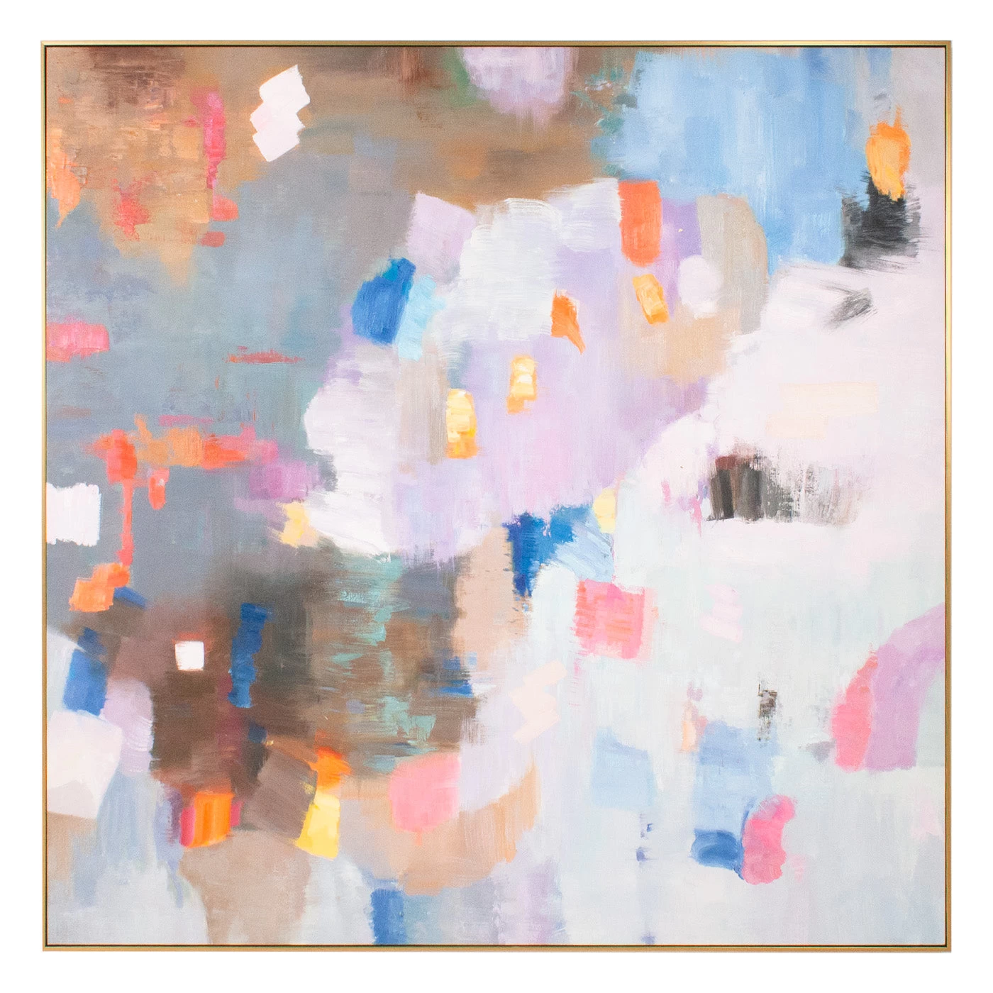 Rowdy yet refined, this piece features abstract hues artfully arranged and giclee printed. Framed in thin gold.