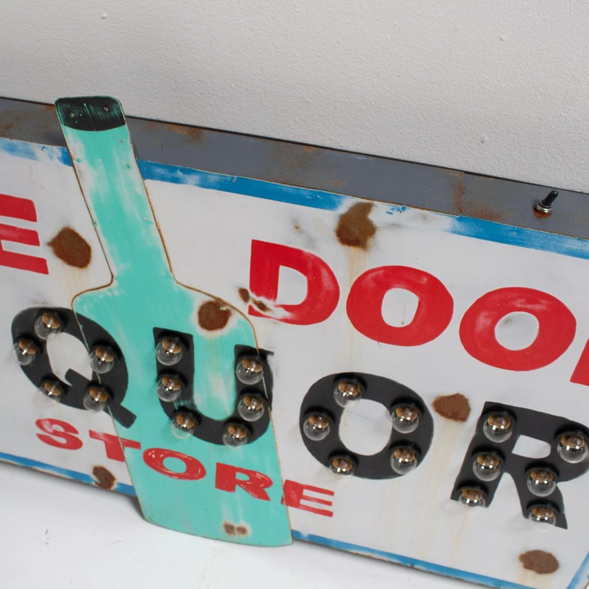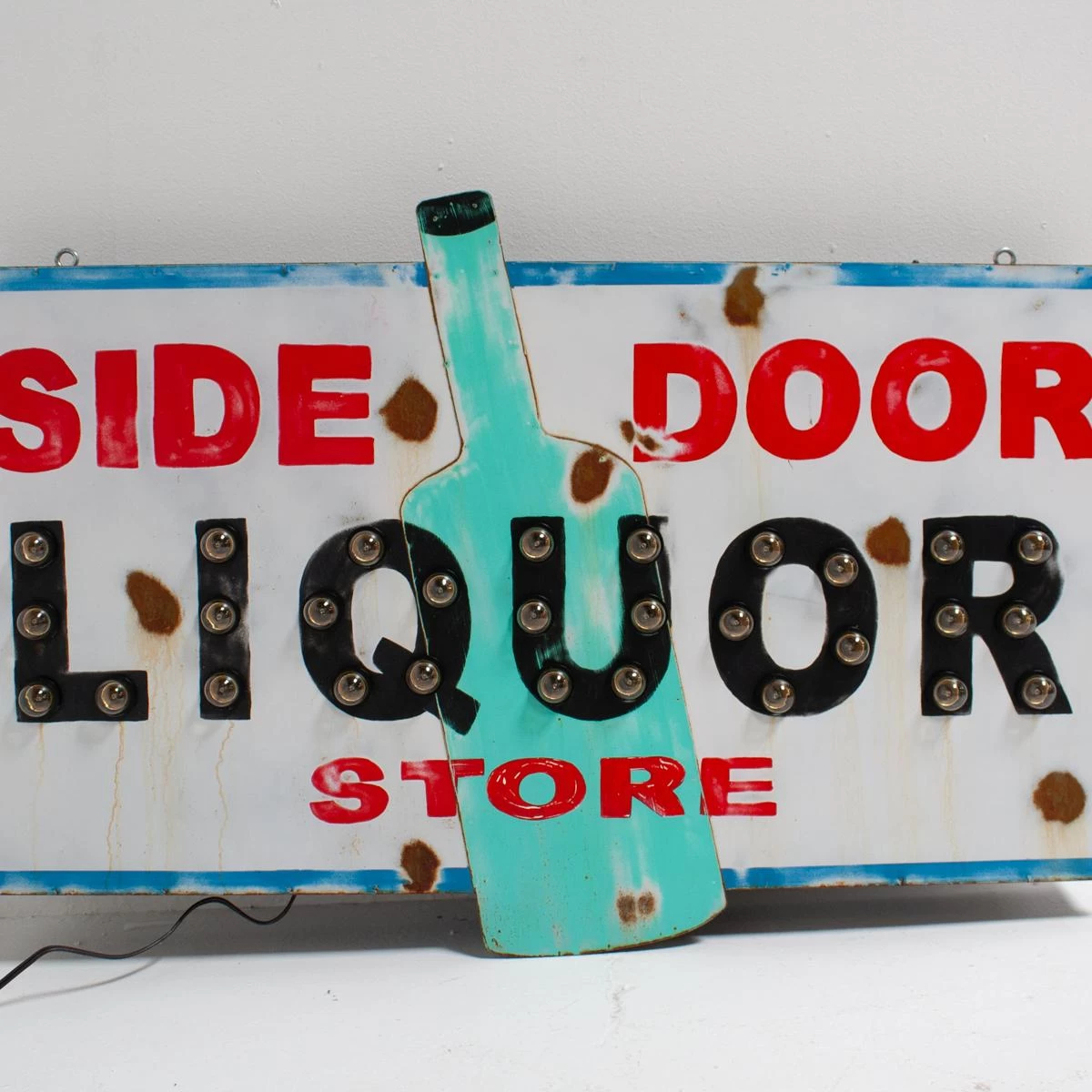 Liquor light-up sign, made to look vintage by artist Garland Murphree. Two light settings with one flashing.
