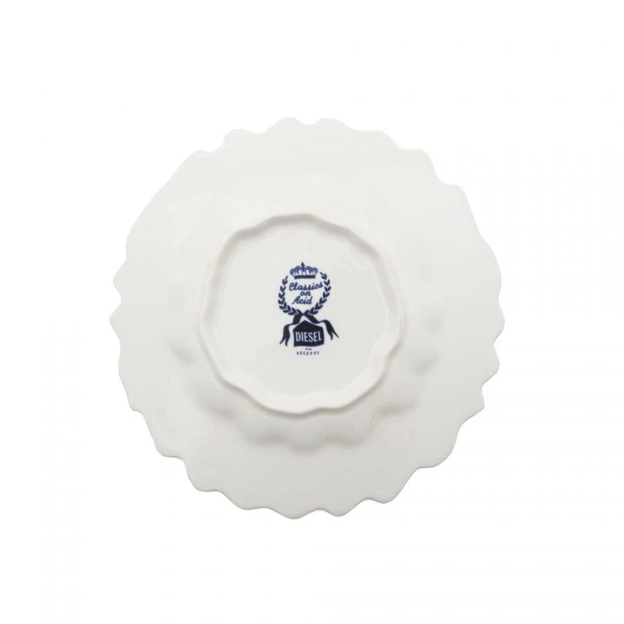 A traditional ceramic with a twist – call it classics on acid. Dessert plate by Seletti featuring a warped Western take on a traditional Chinese motif in blue.